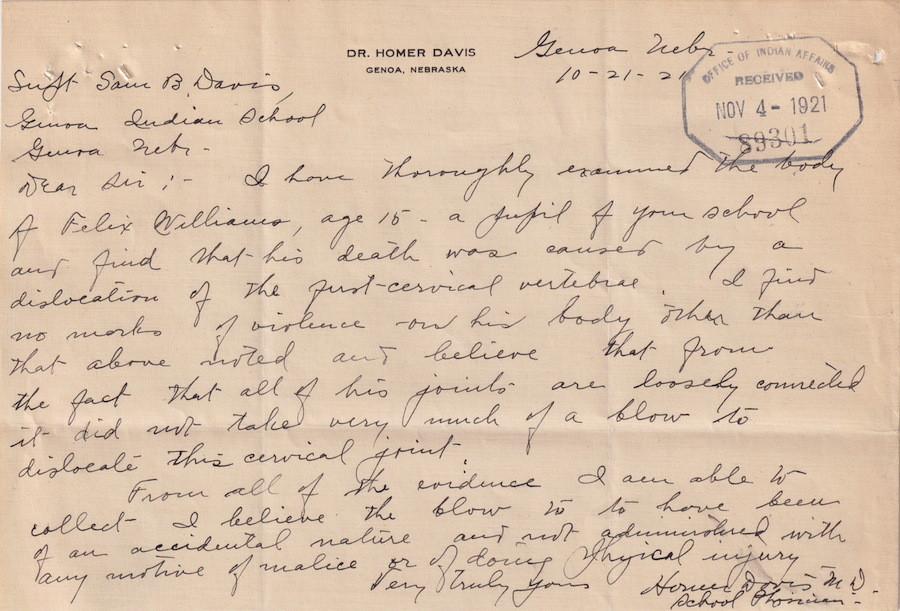 Letter from Homer Davis to Sam B. Davis, 21 Oct. 1921; Folder: 84767-1921-736, Box 20; Central Classified Files, 1907–1939 (NAID 300324); Office of Indian Affairs; Record Group 75; National Archives and Records Administration-Washington, DC.