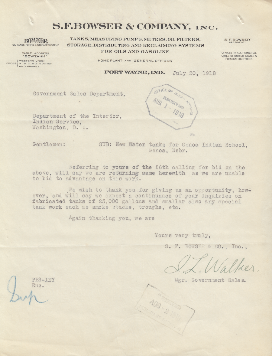 Letter from I. L. Walker to the Department of the Interior, 30 July 1918; Folder: 83054-1917-424, Box 17; Central Classified Files, 1907–1939 (NAID 300324); Office of Indian Affairs; Record Group 75; National Archives and Records Administration-Washington, DC.