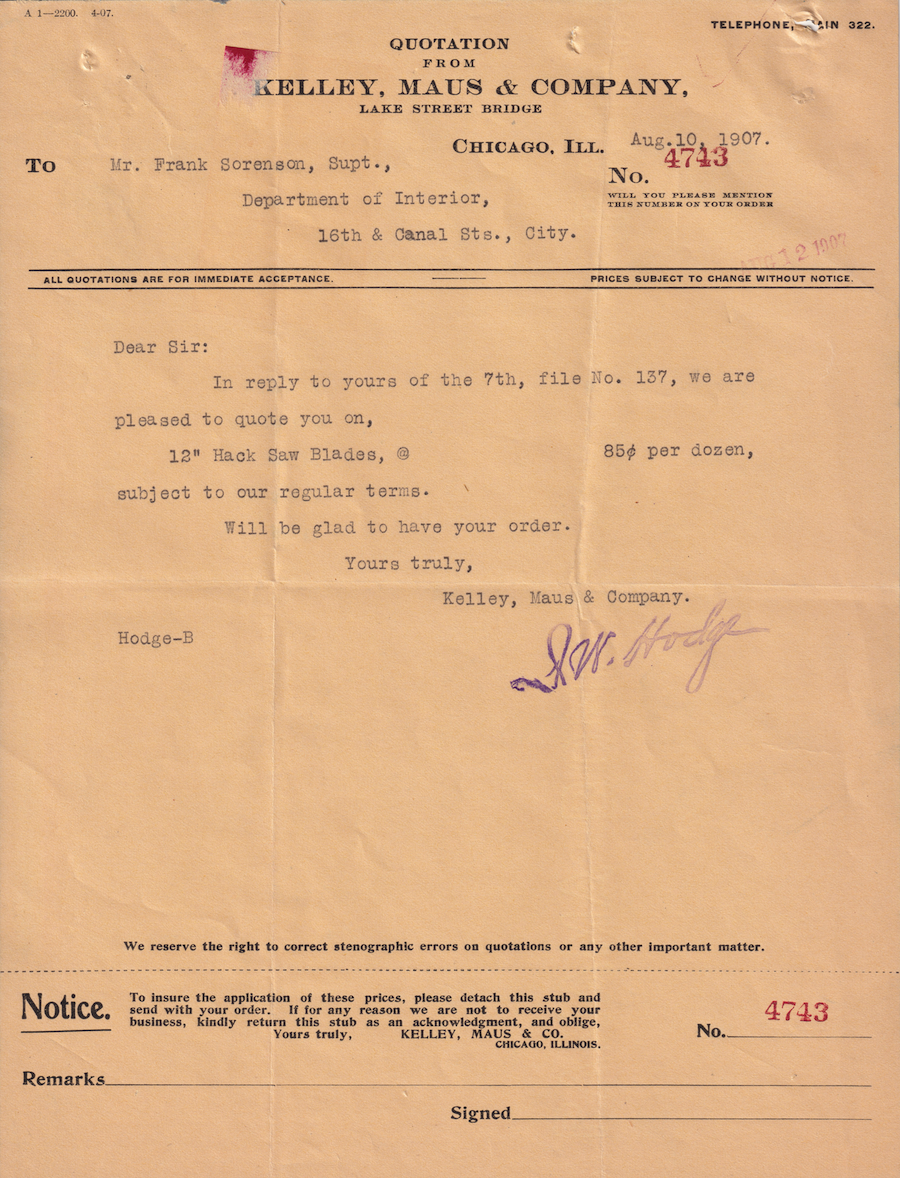 Regarding a quote of 85 cents per dozen for hack saw blades.Identifier: