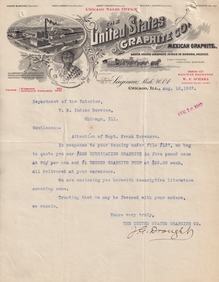 Letter from J. G. Drought to the Department of the Interior, 15 Aug. 1907; Folder: 73700-1907-420, Box 17; Central Classified Files, 1907–1939 (NAID 300324); Office of Indian Affairs; Record Group 75; National Archives and Records Administration-Washington, DC.