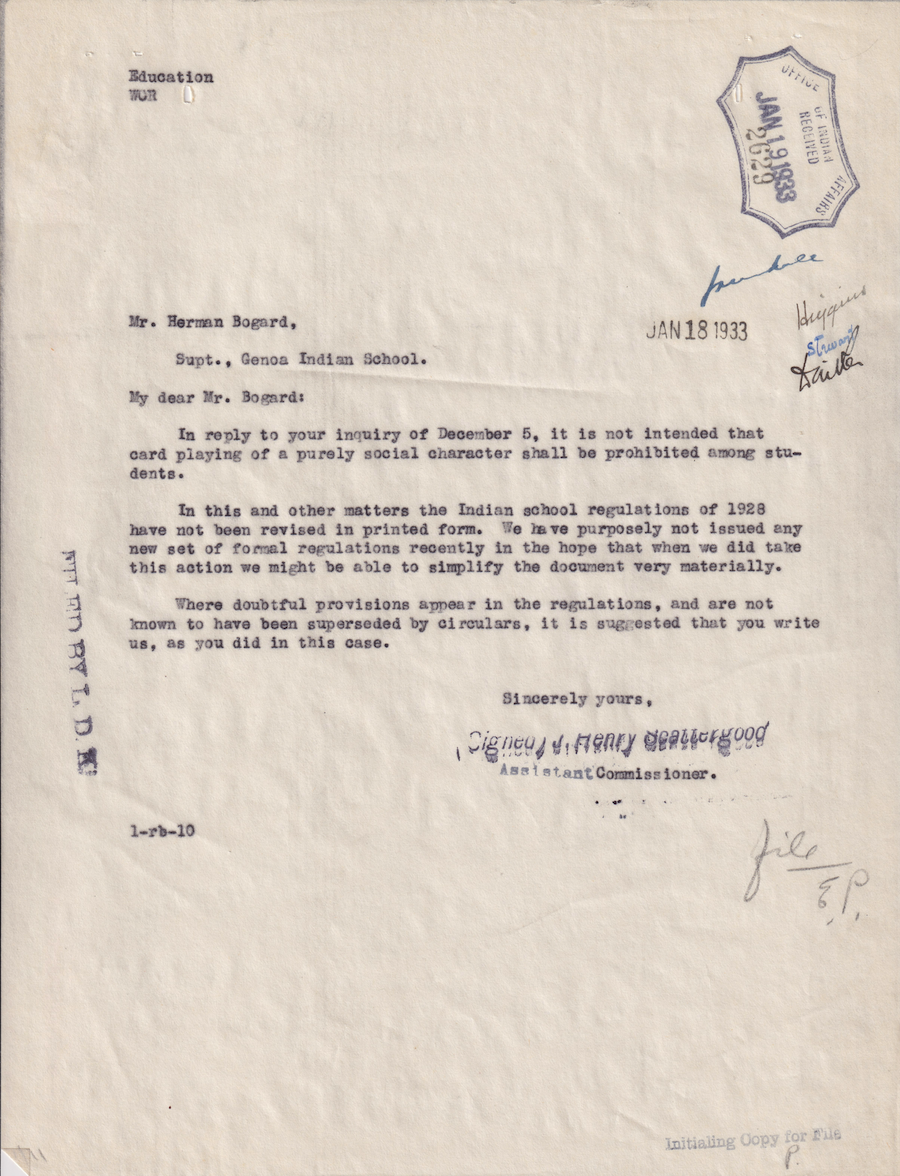 Letter from J. Henry Scattergood to Herman Bogard, 18 Jan. 1933; Folder: 2629-1933-750, Box 20; Central Classified Files, 1907–1939 (NAID 300324); Office of Indian Affairs; Record Group 75; National Archives and Records Administration-Washington, DC.