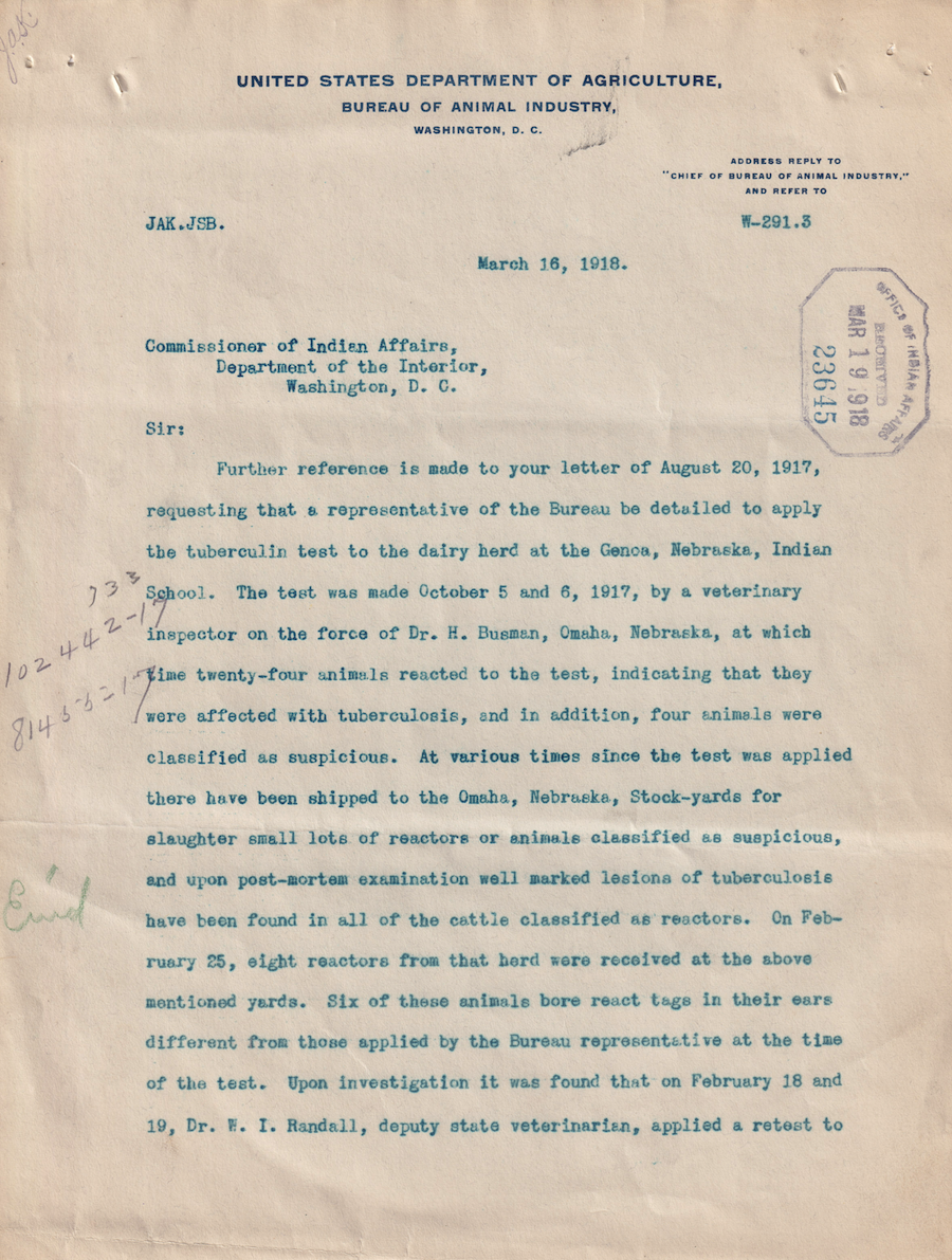 Letter from J. R. Mohler to the Commissioner of Indian Affairs, 16 Mar. 1918; Folder: 102442-1917-733, Box 19; Central Classified Files, 1907–1939 (NAID 300324); Office of Indian Affairs; Record Group 75; National Archives and Records Administration-Washington, DC.
