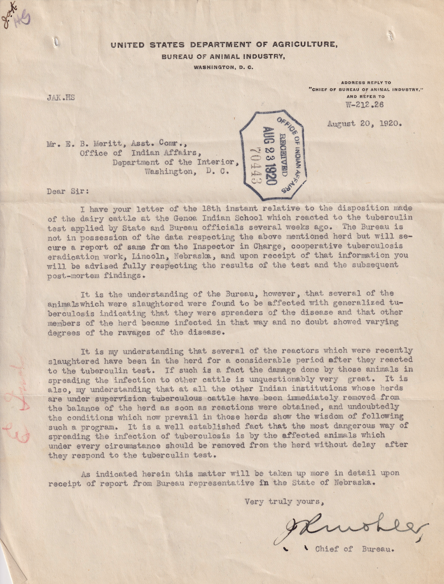 Letter from J. R. Mohler to E. B. Meritt, 20 Aug. 1920; Folder: 102442-1917-733, Box 19; Central Classified Files, 1907–1939 (NAID 300324); Office of Indian Affairs; Record Group 75; National Archives and Records Administration-Washington, DC.