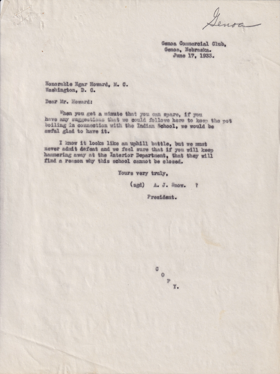 Letter from A. J. Snow to Egar Howard, 17 June 1933; Folder: 45539-1930-800, Box 20; Central Classified Files, 1907–1939 (NAID 300324); Office of Indian Affairs; Record Group 75; National Archives and Records Administration-Washington, DC.
