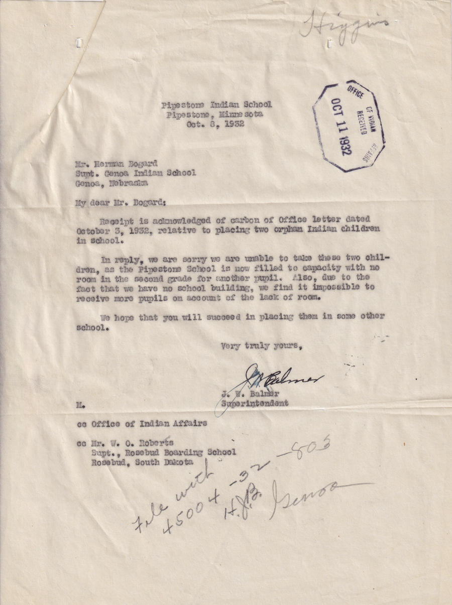 Letter from J. W. Balmer to Herman Bogard, 8 Oct. 1932; Folder: 45004-1932-803, Box 20; Central Classified Files, 1907–1939 (NAID 300324); Office of Indian Affairs; Record Group 75; National Archives and Records Administration-Washington, DC.