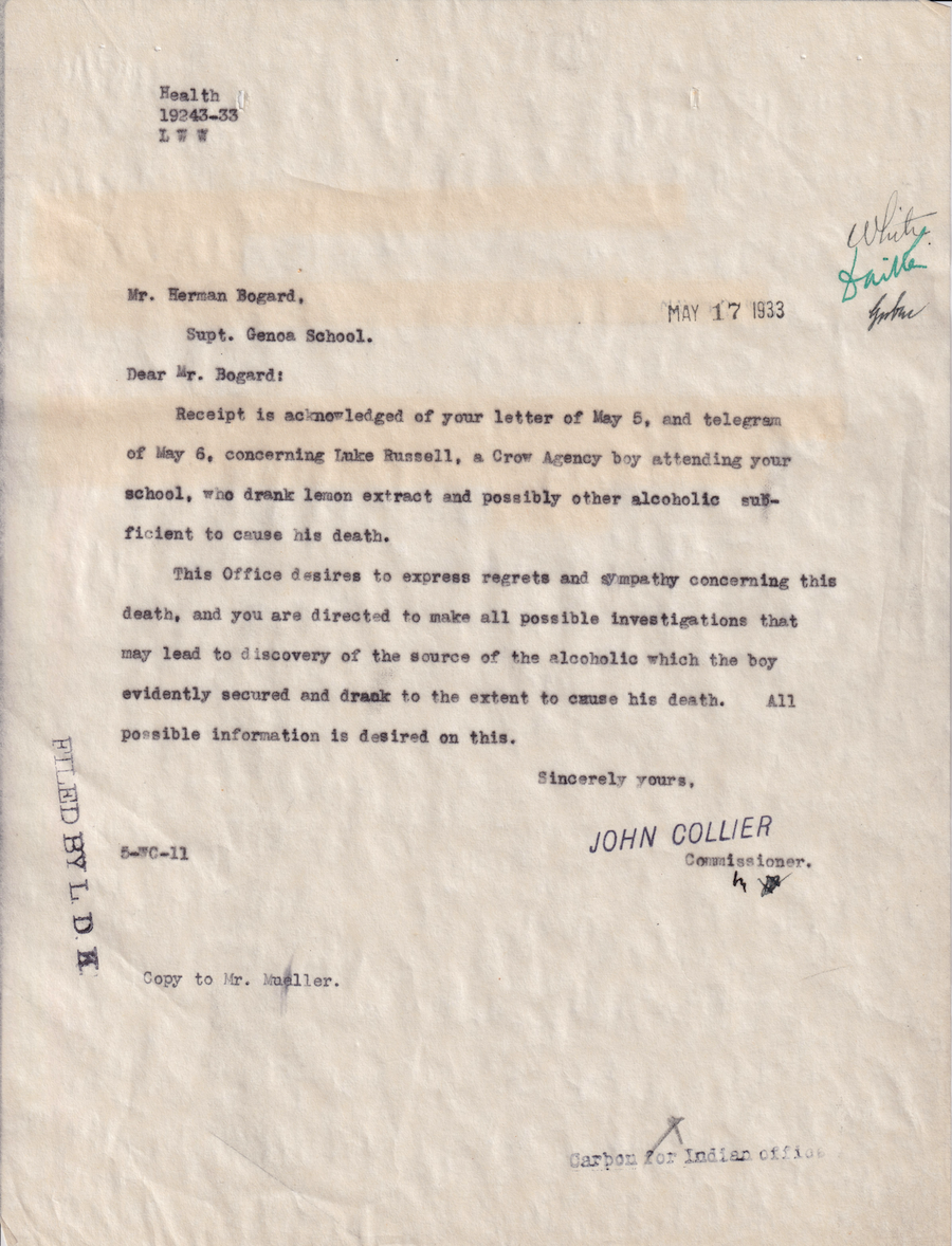 Letter from John Collier to Herman Bogard, 17 May 1933; Folder: 18982-1933-736, Box 20; Central Classified Files, 1907–1939 (NAID 300324); Office of Indian Affairs; Record Group 75; National Archives and Records Administration-Washington, DC.