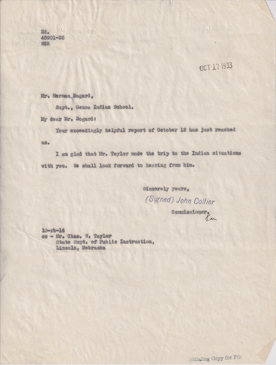Letter from John Collier to Herman Bogard, 17 Oct. 1933; Folder: 45901-1933-803, Box 20; Central Classified Files, 1907–1939 (NAID 300324); Office of Indian Affairs; Record Group 75; National Archives and Records Administration-Washington, DC.
