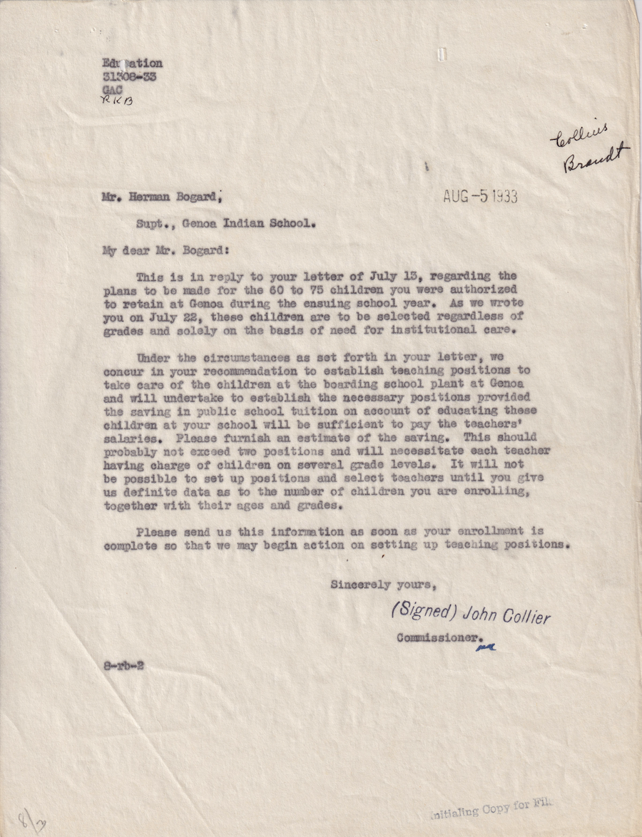 Letter from John Collier to Herman Bogard, 5 Aug. 1933; Folder: 31308-1933-803, Box 20; Central Classified Files, 1907–1939 (NAID 300324); Office of Indian Affairs; Record Group 75; National Archives and Records Administration-Washington, DC.