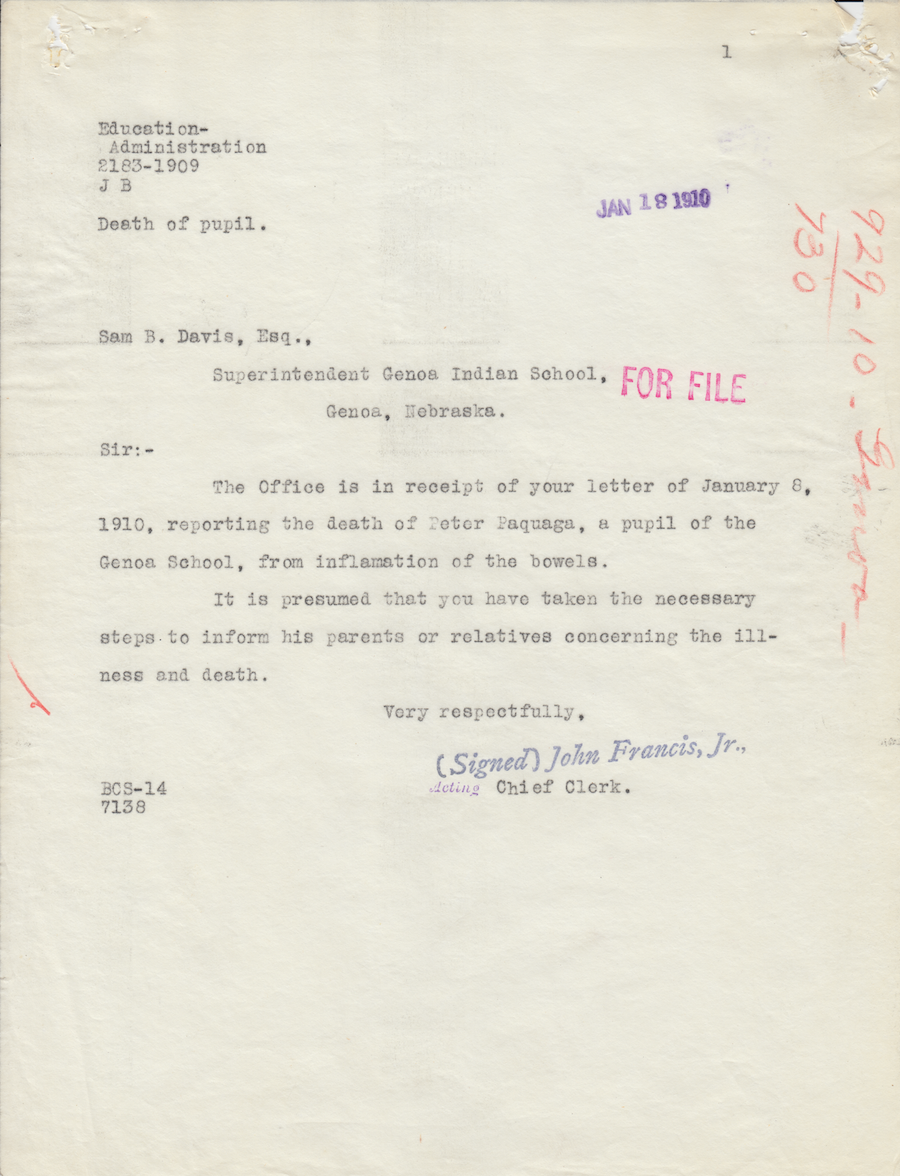 Letter from John Francis Jr. to Sam B. Davis, 19 Jan. 1910; Folder: 929-1910-730, Box 19; Central Classified Files, 1907–1939 (NAID 300324); Office of Indian Affairs; Record Group 75; National Archives and Records Administration-Washington, DC.