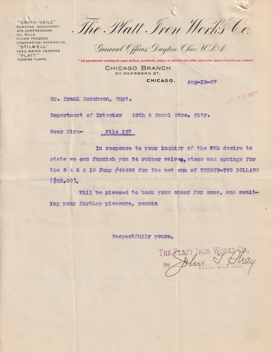 Letter from John J. Shay to Frank Sorenson, 12 Aug. 1907; Folder: 73700-1907-420, Box 17; Central Classified Files, 1907–1939 (NAID 300324); Office of Indian Affairs; Record Group 75; National Archives and Records Administration-Washington, DC.