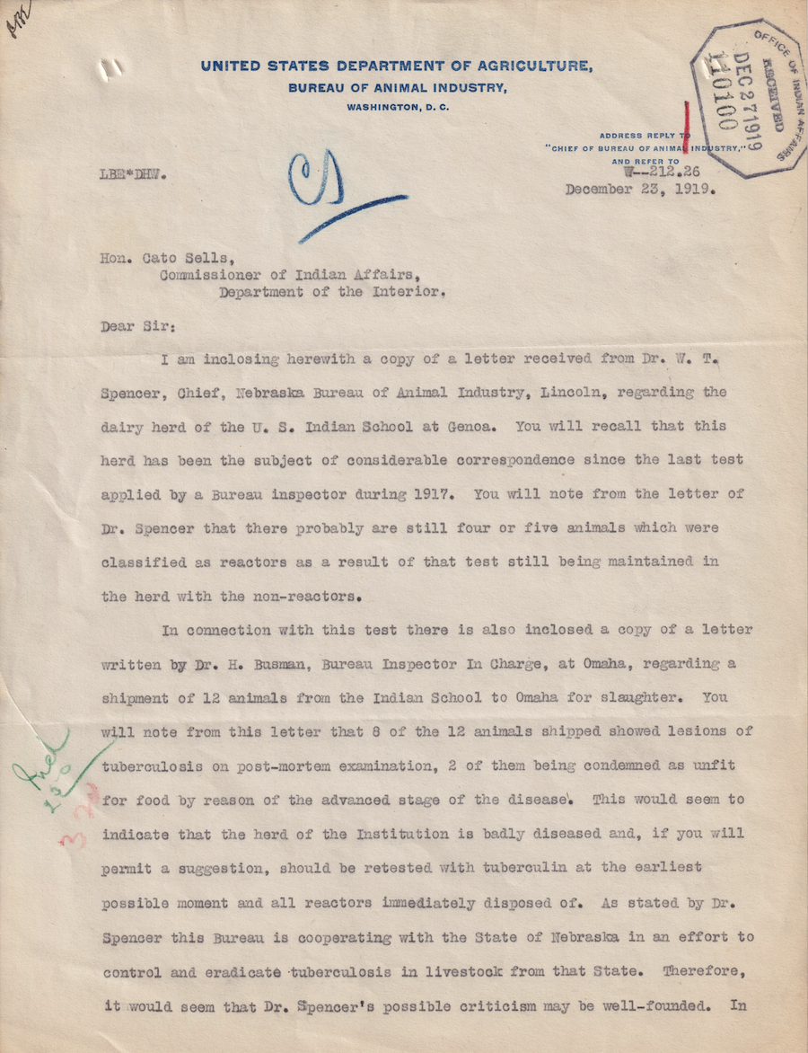 Letter from John R. Mohler to Cato Sells, 23 Dec. 1919; Folder: 102442-1917-733, Box 19; Central Classified Files, 1907–1939 (NAID 300324); Office of Indian Affairs; Record Group 75; National Archives and Records Administration-Washington, DC.