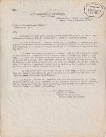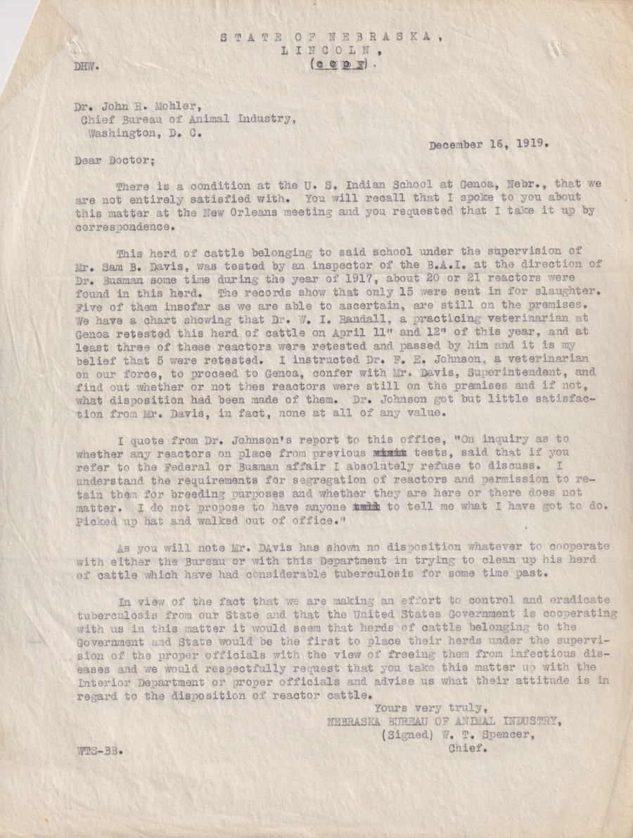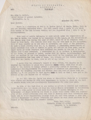 Regarding an infection of tuberculosis in the school's dairy herd, the testing of animals for condemnation, and tension between the Bureau of Animal Industry and the school due to loss of livestock.Description: