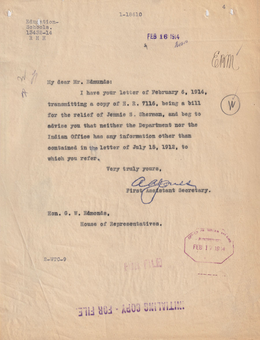 Letter from A. A. Jones to G. W. Edmonds, 16 Feb. 1914; Folder: 53726-1912-732, Box 19; Central Classified Files, 1907–1939 (NAID 300324); Office of Indian Affairs; Record Group 75; National Archives and Records Administration-Washington, DC.