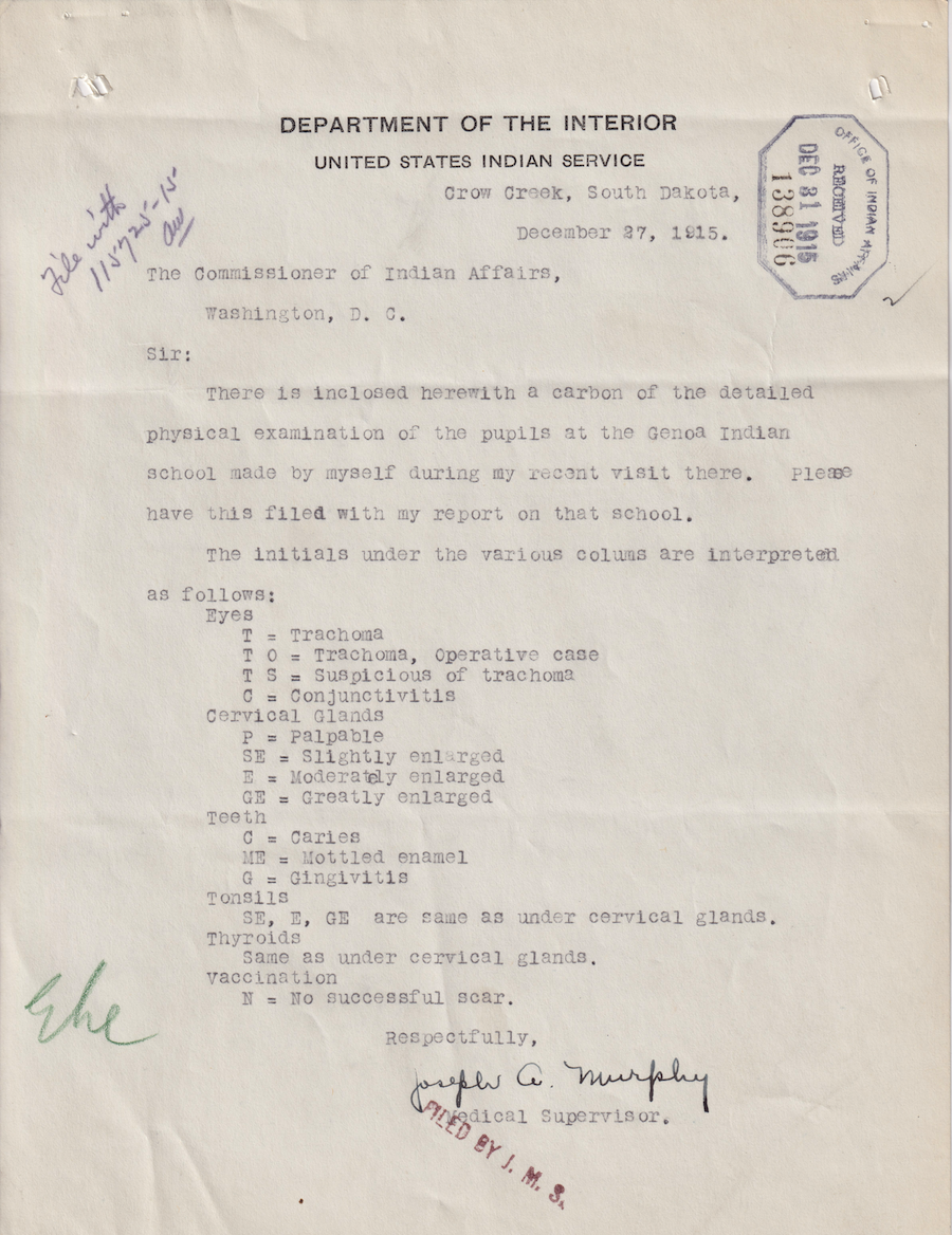 Letter from Joseph C. Murphy to the Commissioner of Indian Affairs, 27 Dec. 1915; Folder: 115725-1915-732, Box 17; Central Classified Files, 1907–1939 (NAID 300324); Office of Indian Affairs; Record Group 75; National Archives and Records Administration-Washington, DC.