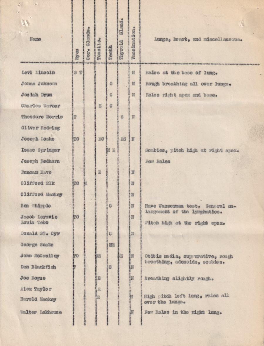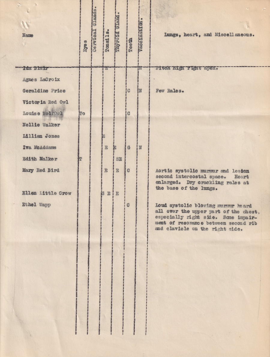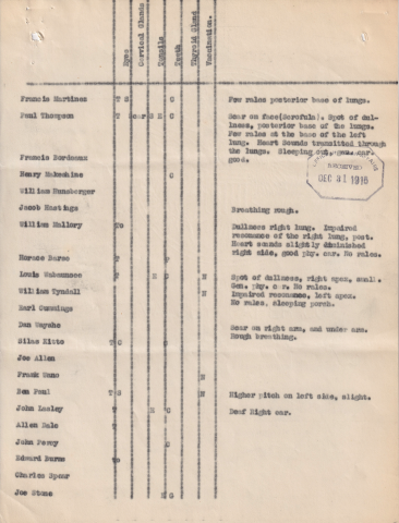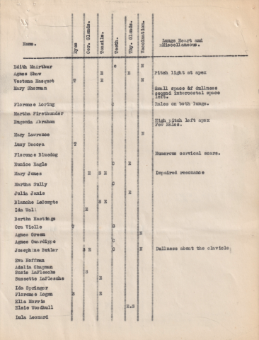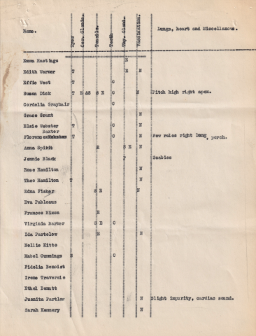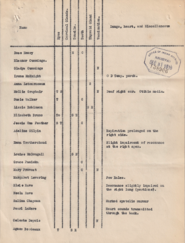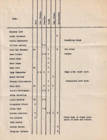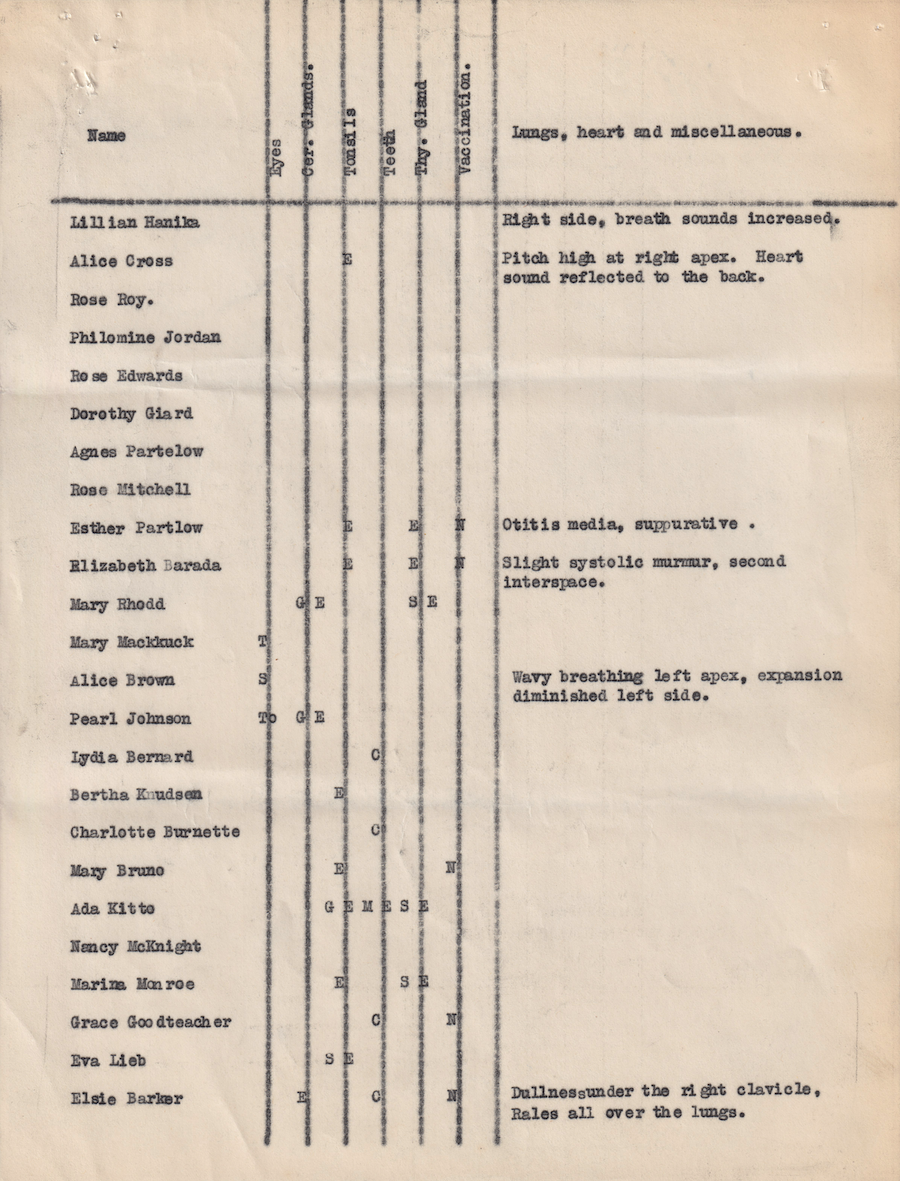 Regarding physical examinations of the pupils' eyes, cervical glands, teeth tonsils, thyroids, and vaccinations.Description: