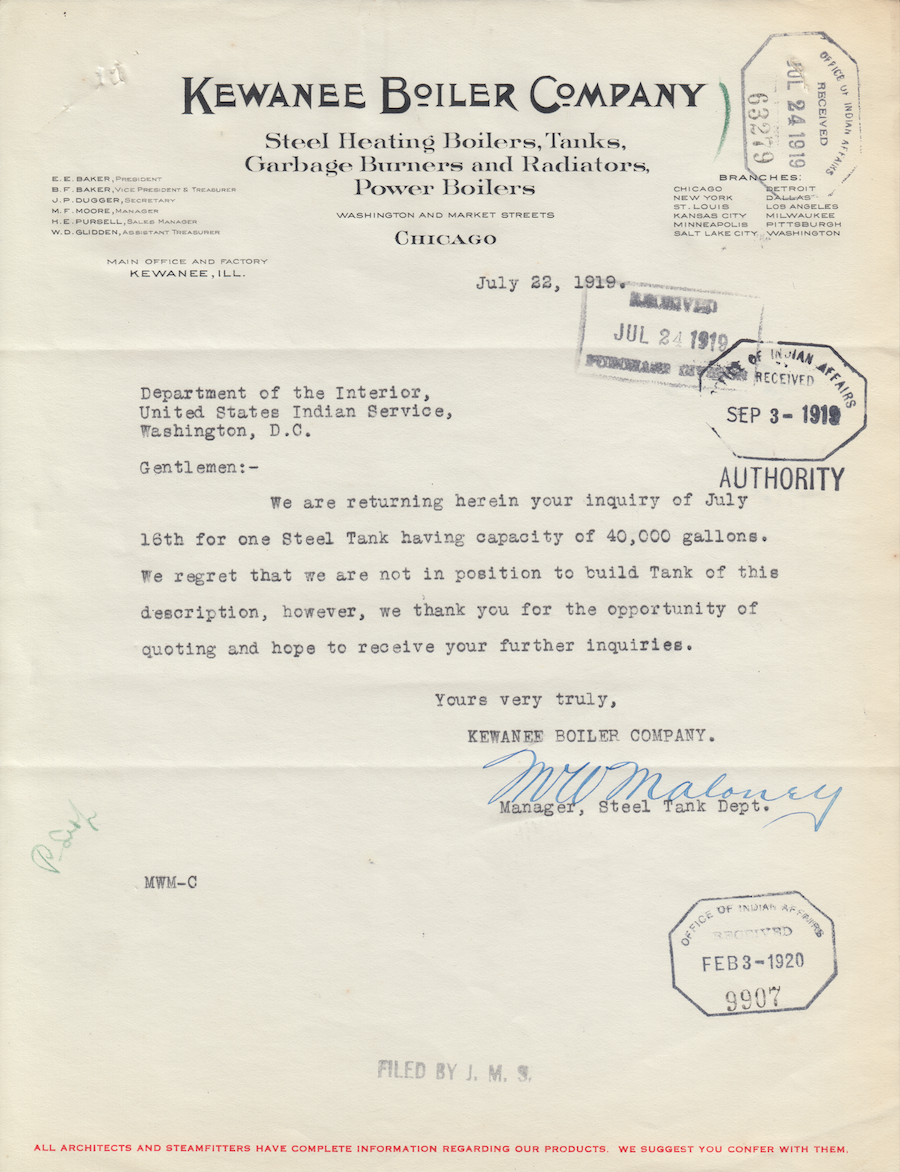 Letter from M. W. Maloney to the Department of the Interior, 22 July. 1919; Folder: 83054-1917-424, Box 17; Central Classified Files, 1907–1939 (NAID 300324); Office of Indian Affairs; Record Group 75; National Archives and Records Administration-Washington, DC.