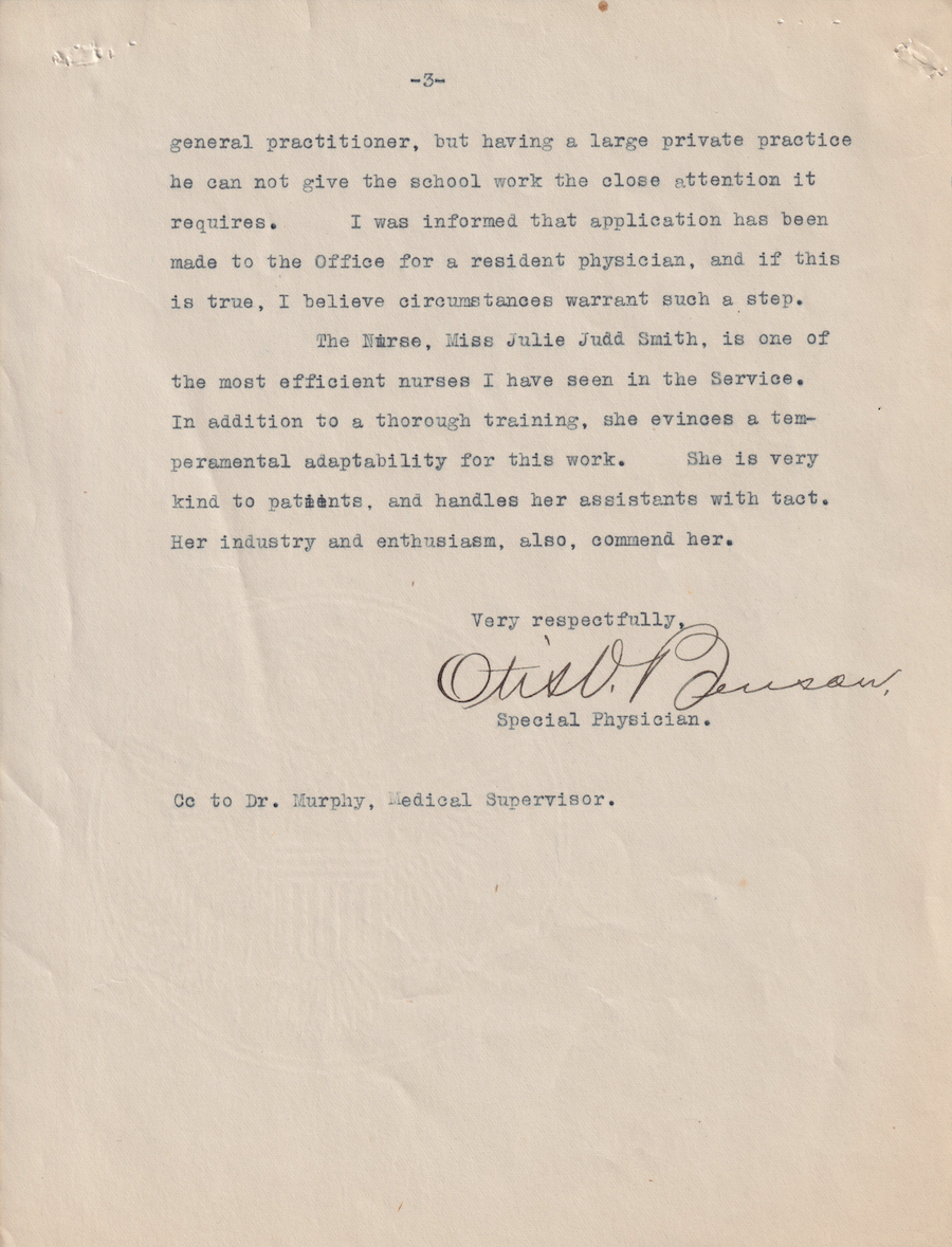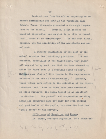 Regarding a report on medical examinations, hospital conditions, sanitary practices, and efficiency of physician and nurse..Description: