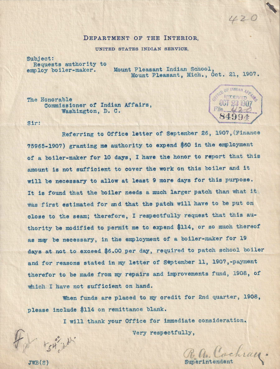 Letter from R. A. Cochran to the Commissioner of Indian Affairs, 21 Oct. 1907; Folder: 84994-1907-420, Box 17: Central Classified Files, 1907–1939 (NAID 300324); Office of Indian Affairs; Record Group 75; National Archives and Records Administration-Washington, DC.