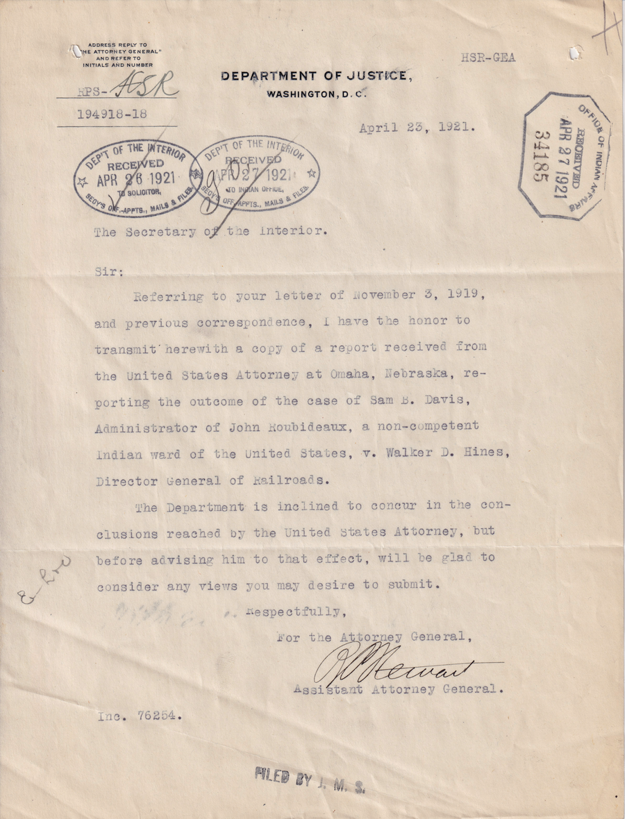 Letter from R. Newart to the Secretary of the Interior, 23 Apr. 1921; Folder: 53707-1918-736, Box 20; Central Classified Files, 1907–1939 (NAID 300324); Office of Indian Affairs; Record Group 75; National Archives and Records Administration-Washington, DC.