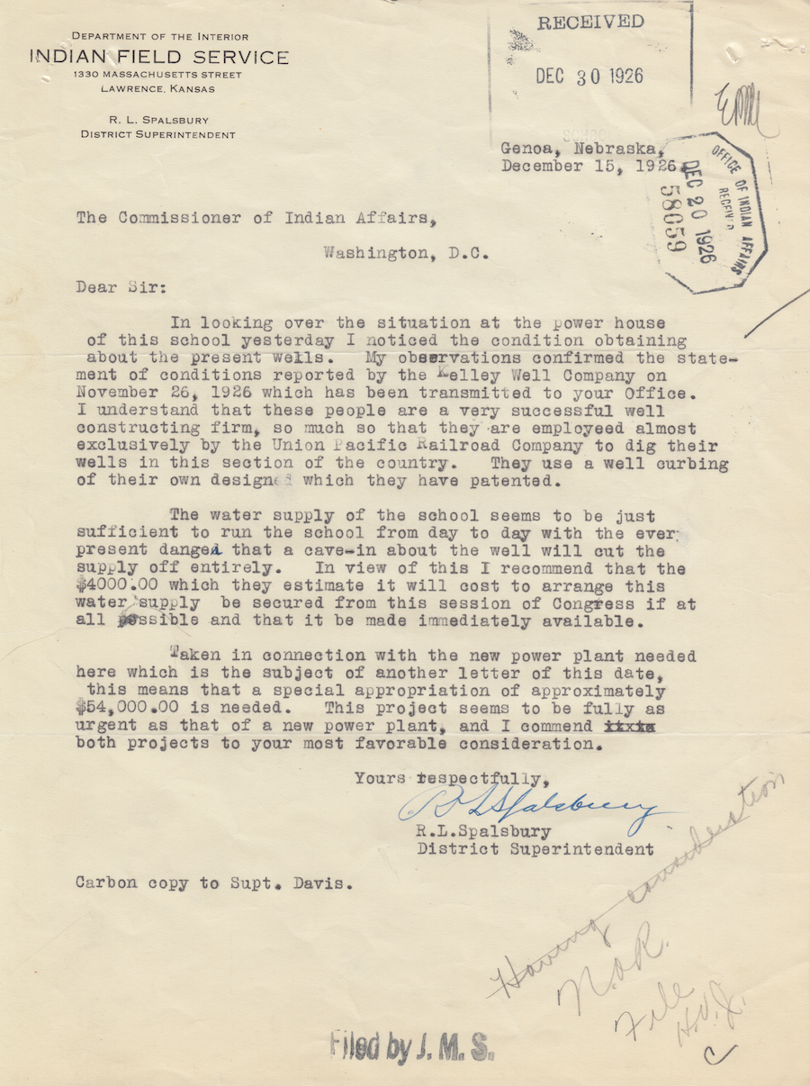 Letter from R. L. Spalsbury to the Commissioner of Indian Affairs, 15 Dec. 1926; Folder: 50496-1926-424, Box 17; Central Classified Files, 1907–1939 (NAID 300324); Office of Indian Affairs; Record Group 75; National Archives and Records Administration-Washington, DC.