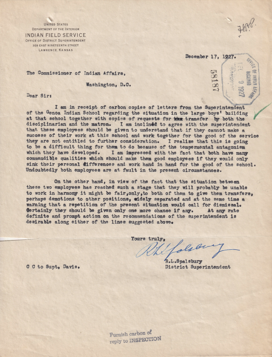 Letter from R. L. Spalsbury to the Commissioner of Indian Affairs, 17 Dec. 1927