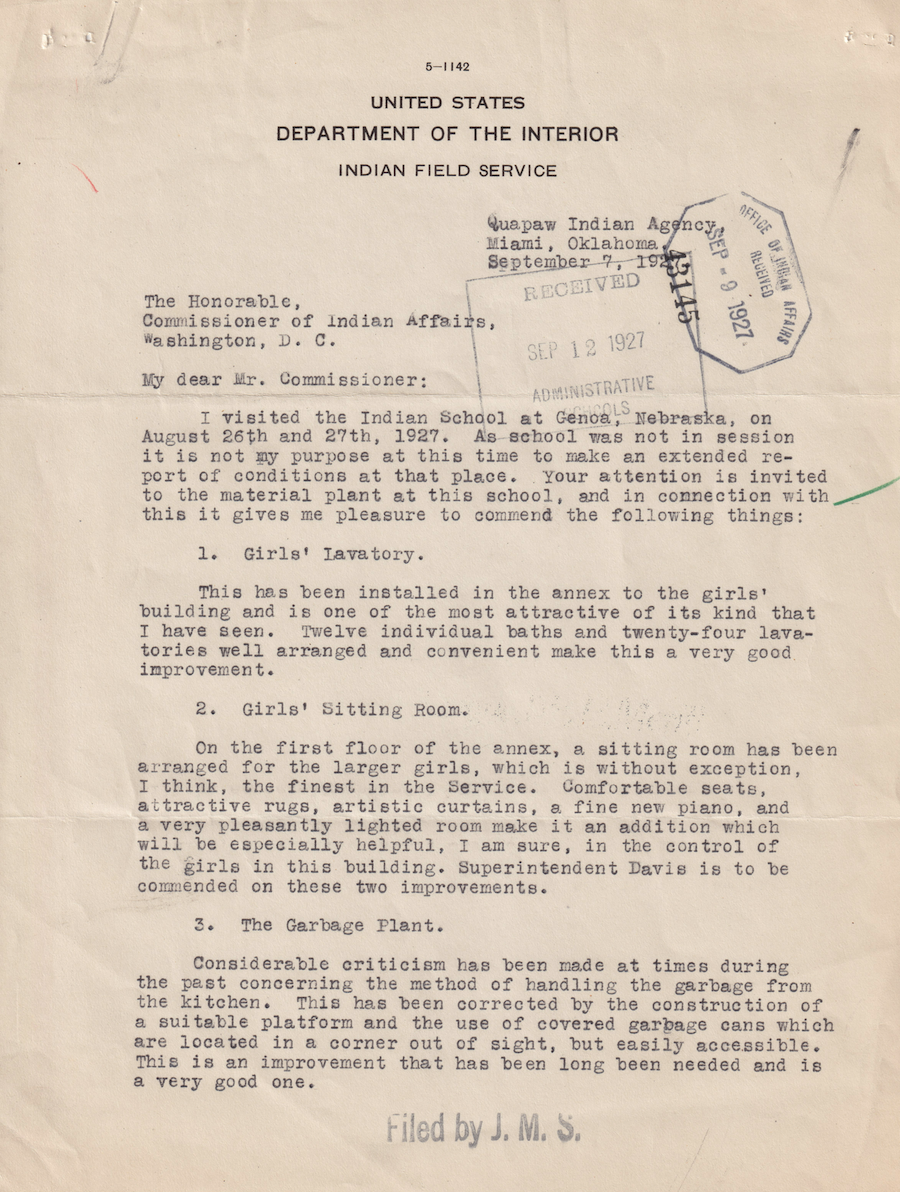 Letter from R. L. Spalsbury to the Commissioner of Indian Affairs, 7 Sept. 1927; Folder: 43145-1927-410, Box 17; Central Classified Files, 1907–1939 (NAID 300324); Office of Indian Affairs; Record Group 75; National Archives and Records Administration-Washington, DC.