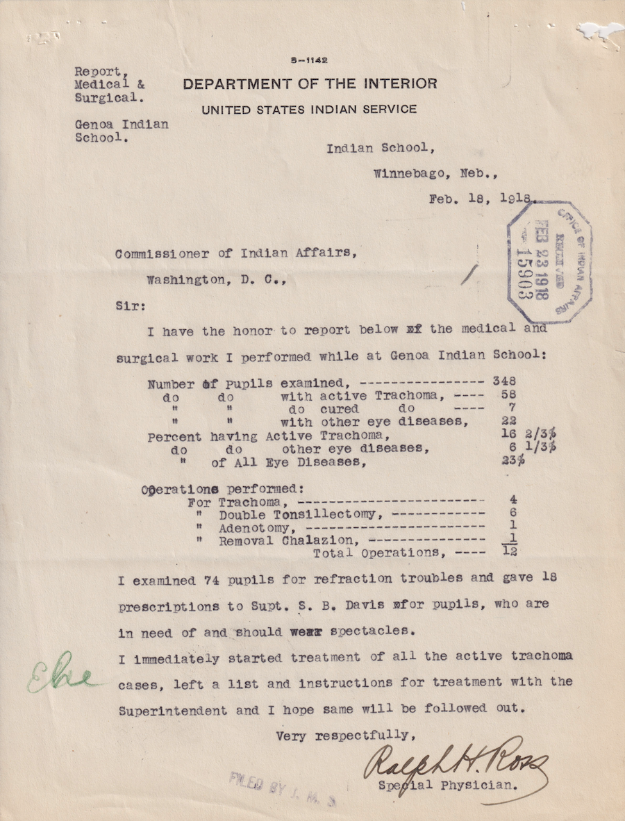 Letter from Ralph H. Ross to Commissioner of Indian Affairs, 18 Feb. 1918; Folder: 7642-1922-734, Box 20; Central Classified Files, 1907–1939 (NAID 300324); Office of Indian Affairs; Record Group 75; National Archives and Records Administration-Washington, DC.