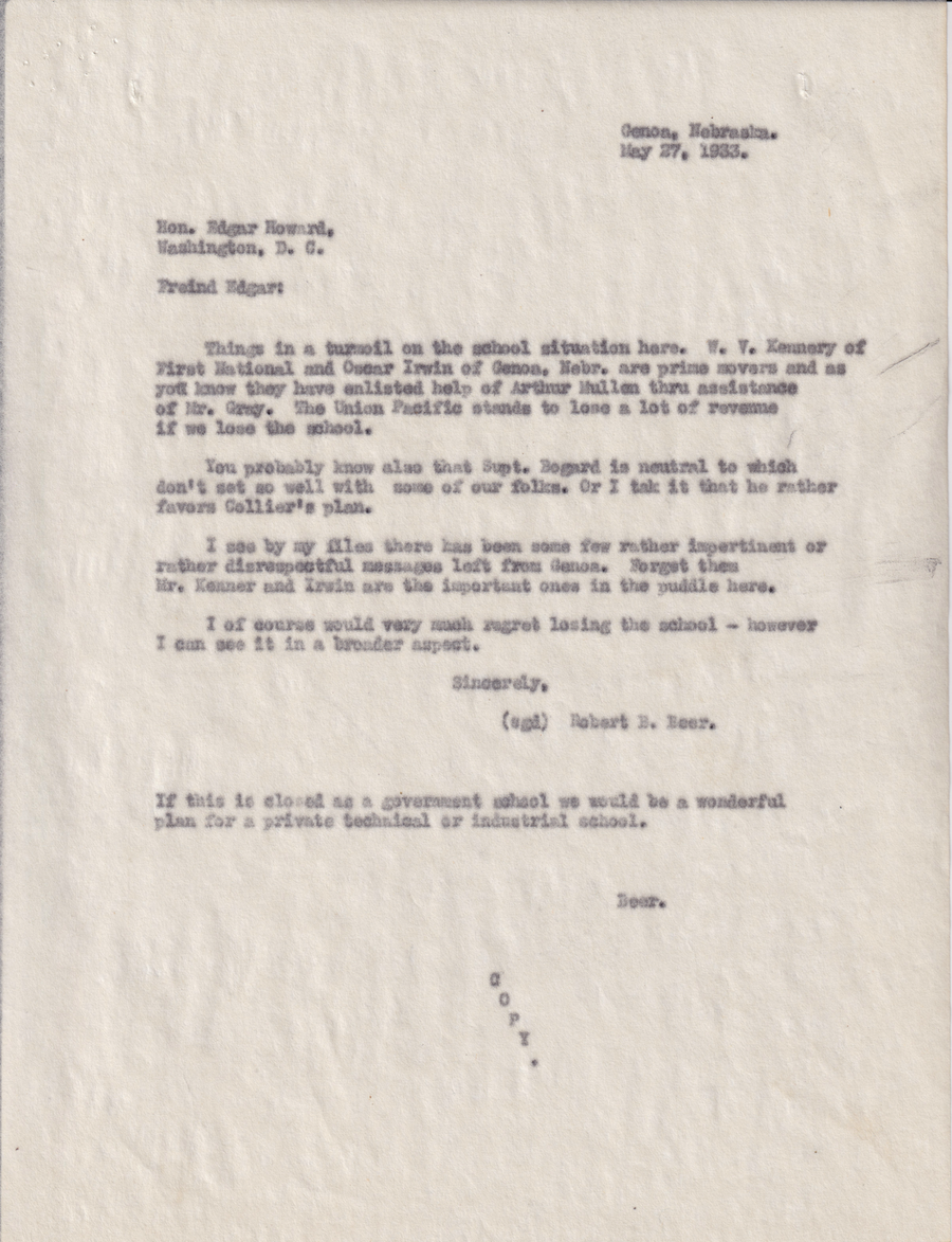 Letter from Robert B. Beer to Edgar Howard, 27 May 1933; Folder: 45539-1930-800, Box 20; Central Classified Files, 1907–1939 (NAID 300324); Office of Indian Affairs; Record Group 75; National Archives and Records Administration-Washington, DC.