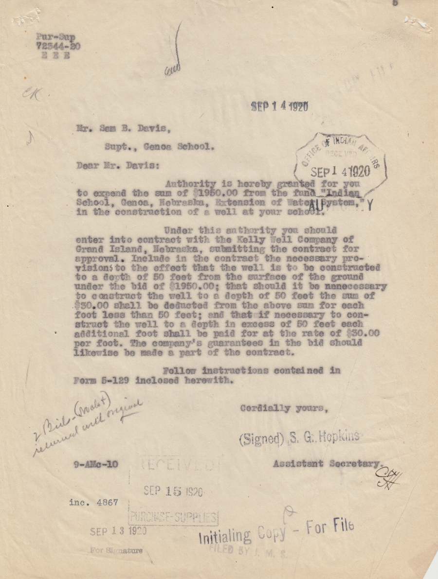 Letter from S. G. Hopkins to Sam B. Davis; 14 Sept. 1920; Folder: 72344-1920-424, Box 17; Central Classified Files, 1907–1939 (NAID 300324); Office of Indian Affairs; Record Group 75; National Archives and Records Administration-Washington, DC.