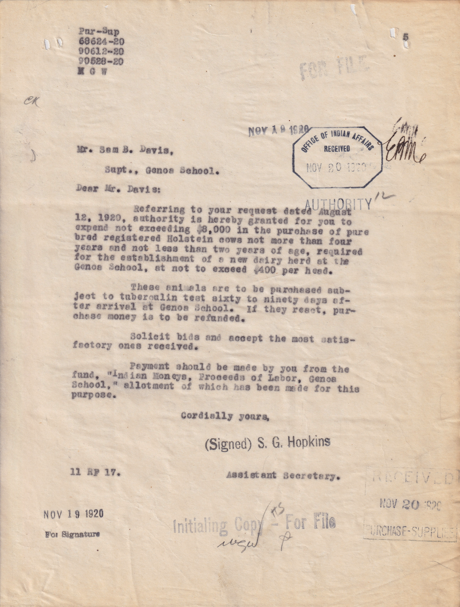 Letter from S. G. Hopkins to Sam B. Davis, 19 Nov. 1920; Folder: 102442-1917-733, Box 19; Central Classified Files, 1907–1939 (NAID 300324); Office of Indian Affairs; Record Group 75; National Archives and Records Administration-Washington, DC.