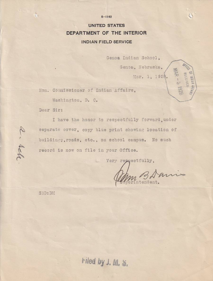 Letter from Sam B. Davis to the Commissioner of Indian Affairs, 1 Mar. 1928; Folder: 50978-1927-410, Box 17; Central Classified Files, 1907–1939 (NAID 300324); Office of Indian Affairs; Record Group 75; National Archives and Records Administration-Washington, DC.