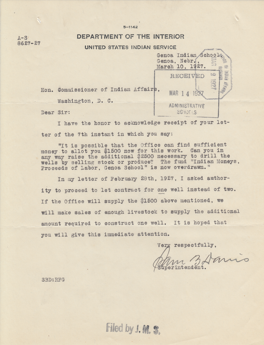 Letter from Sam B. Davis to the Commissioner of Indian Affairs, 10 Mar. 1927; Folder: 50496-1926-424, Box 17; Central Classified Files, 1907–1939 (NAID 300324); Office of Indian Affairs; Record Group 75; National Archives and Records Administration-Washington, DC.