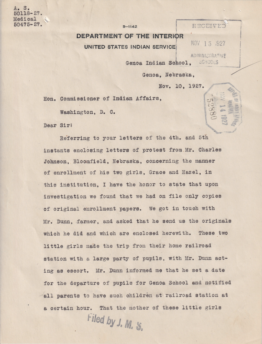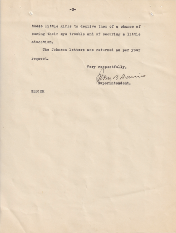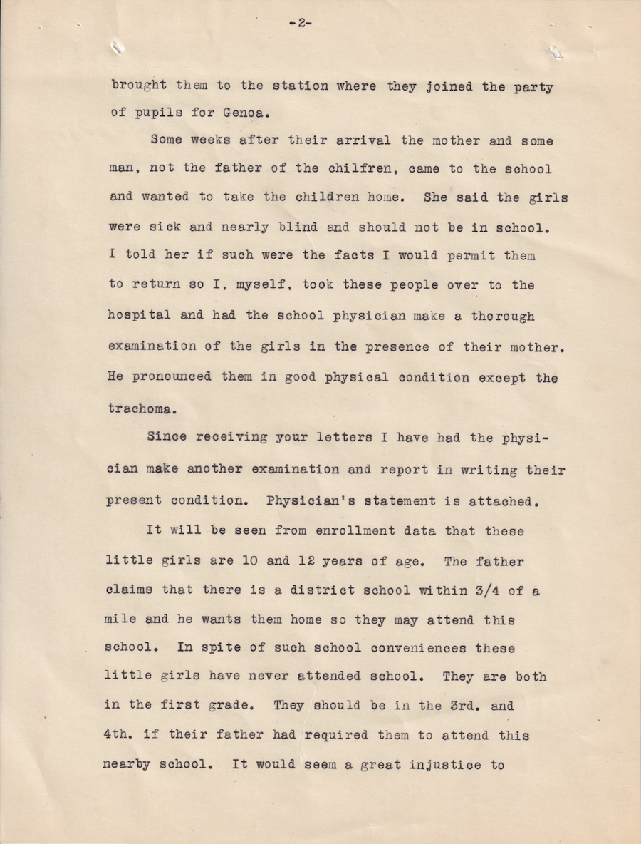 Regarding two girls who traveled to Genoa with trachoma and their father's request that they be sent home to attend a school 3/4 a mile away from their home in Bloomfield, Nebraska.Identifier: