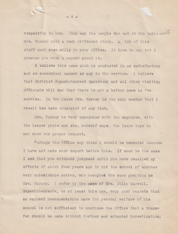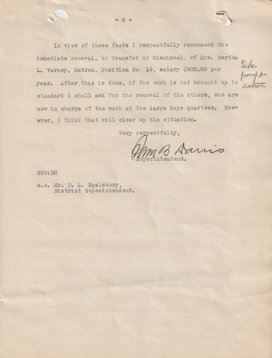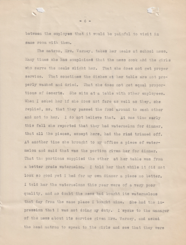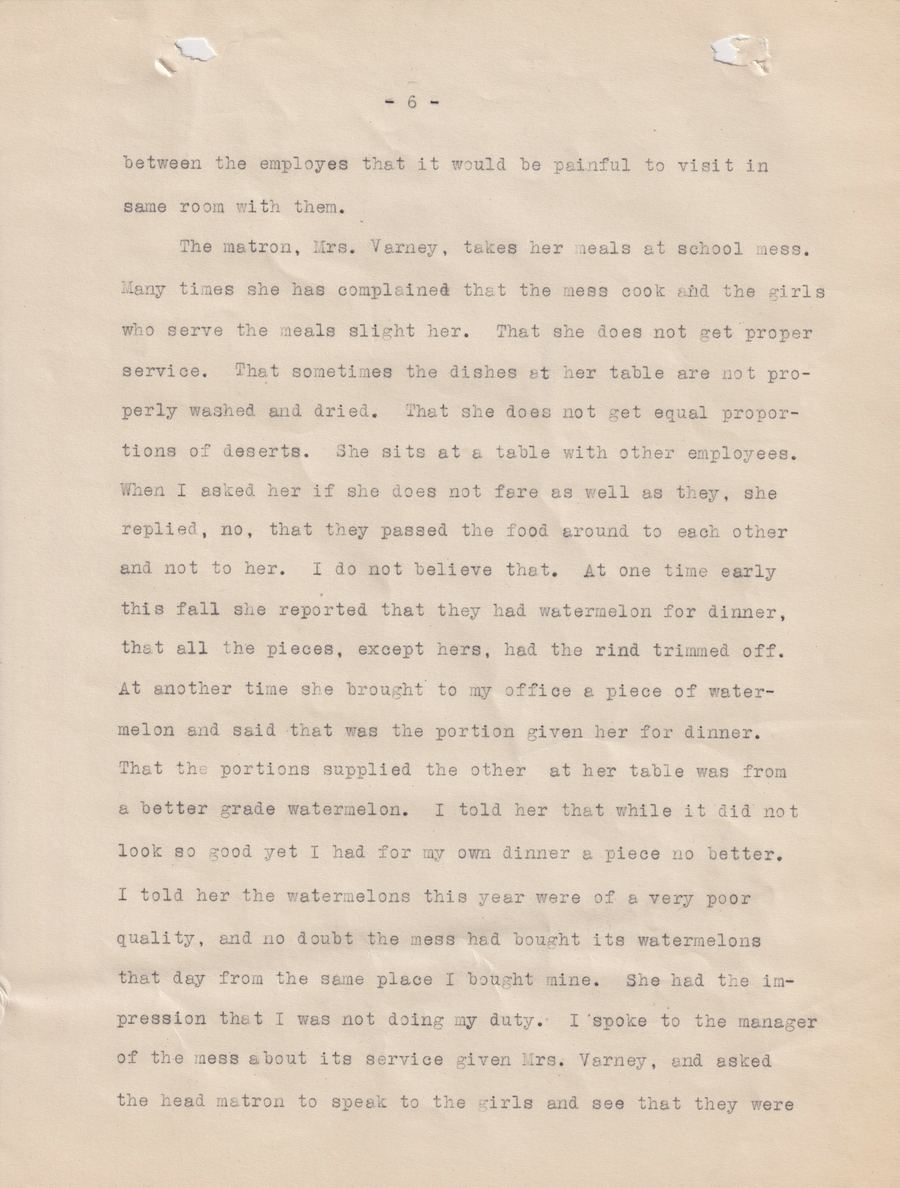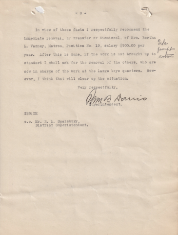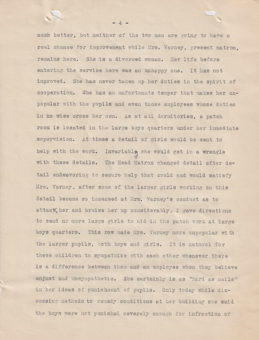 This letter describes the working relationship between three employee's in the large boys' dormitory including Mr. Jones, Mr. Hall and Mrs. Bertha L. Varney. Mrs. Varney is considered "hard as nails" and "unpopular with pupils." She is considered to be transferred.