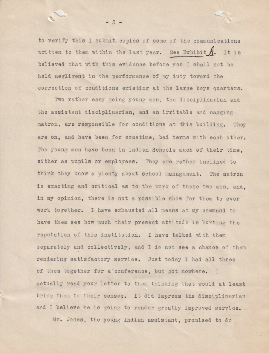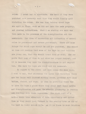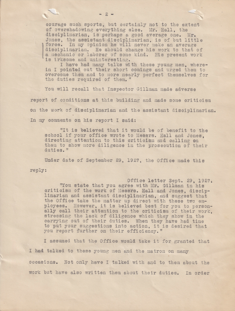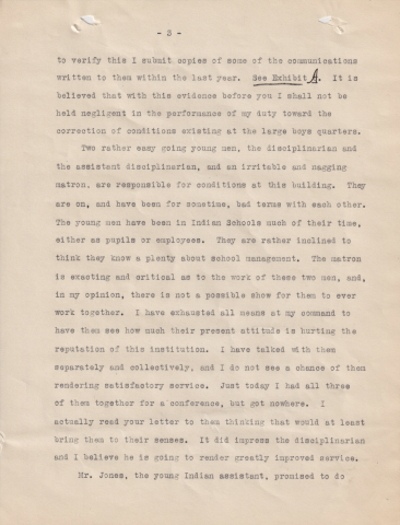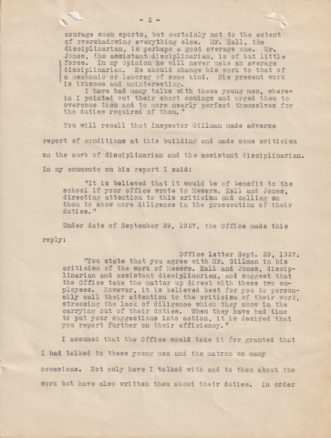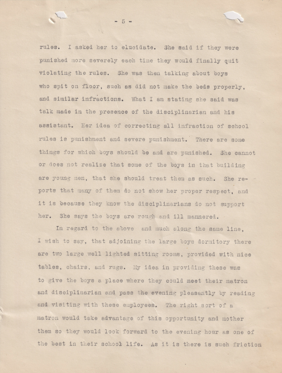 This letter describes the working relationship between three employee's in the large boys' dormitory including Mr. Jones, Mr. Hall and Mrs. Bertha L. Varney. Mrs. Varney is considered "hard as nails" and "unpopular with pupils." She is considered to be transferred.