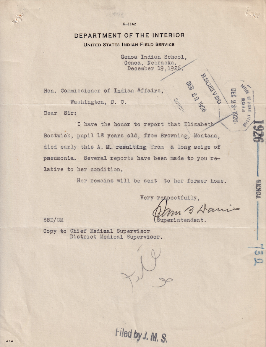 Letter from Sam B. Davis to the Commissioner of Indian Affairs, 12 Nov. 1926; Folder: 00-1926-732, Box 19; Central Classified Files, 1907–1939 (NAID 300324); Office of Indian Affairs; Record Group 75; National Archives and Records Administration-Washington, DC