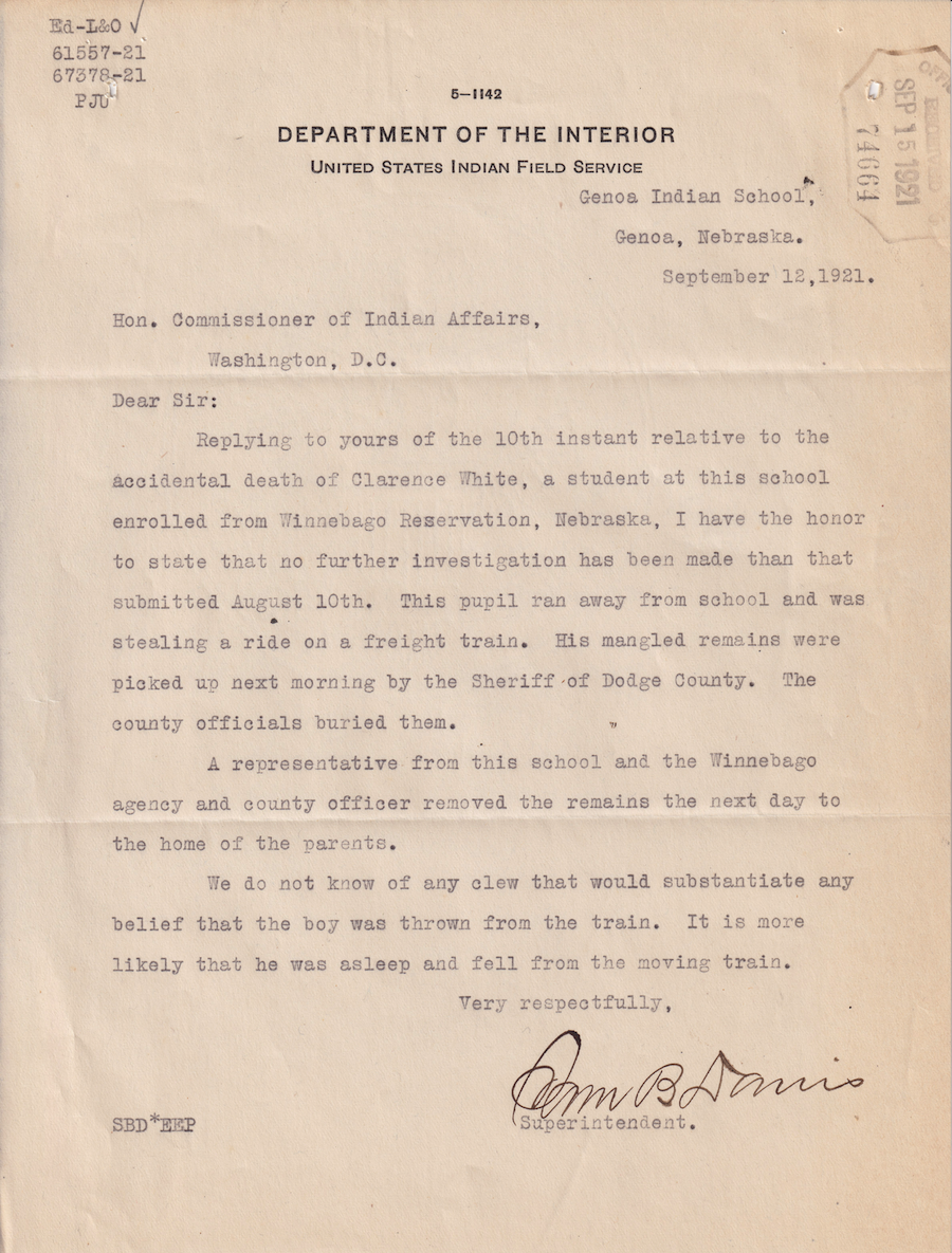 Letter from Sam B. Davis to Commissioner of the Indian Affairs, 12 Sept. 1921; Folder: 61557-1921-736, Box 20; Central Classified Files, 1907–1939 (NAID 300324); Office of Indian Affairs; Record Group 75; National Archives and Records Administration-Washington, DC.