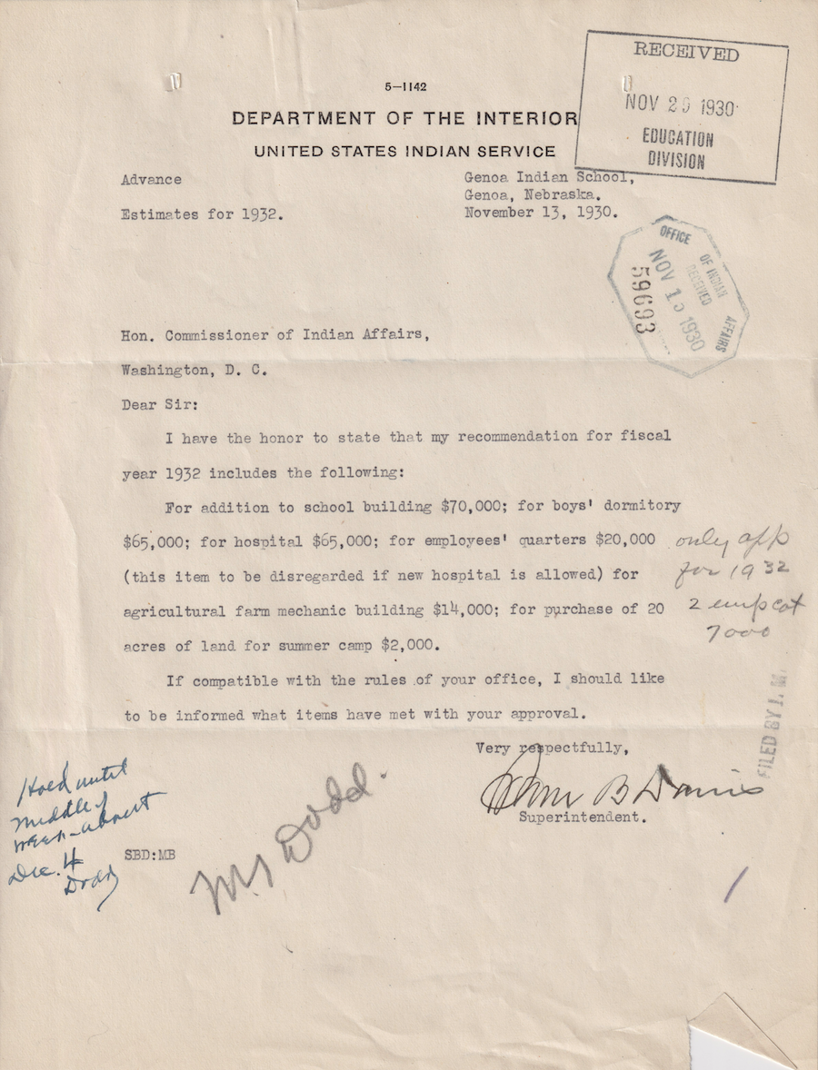 Letter from Sam B. Davis to the Commissioner of Indian Affairs, 13 Nov. 1930; Folder: 59693-1930-410, Box 17; Central Classified Files, 1907–1939 (NAID 300324); Office of Indian Affairs; Record Group 75; National Archives and Records Administration-Washington, DC.