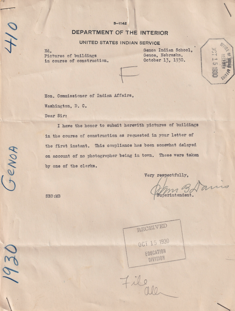 Letter from Sam B. Davis to the Commissioner of Indian Affairs, 13 Oct. 1930; Folder: 00-1930-410, Box 17; Central Classified Files, 1907–1939 (NAID 300324); Office of Indian Affairs; Record Group 75; National Archives and Records Administration-Washington, DC.