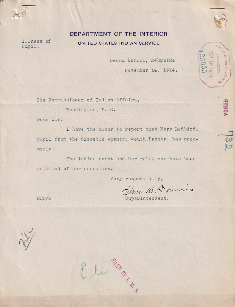 Letter from Sam B. Davis to the Commissioner of Indian Affairs, 14 Nov. 1914; Folder: 123035-1914-732, Box 19; Central Classified Files, 1907–1939 (NAID 300324); Office of Indian Affairs; Record Group 75; National Archives and Records Administration-Washington, DC.