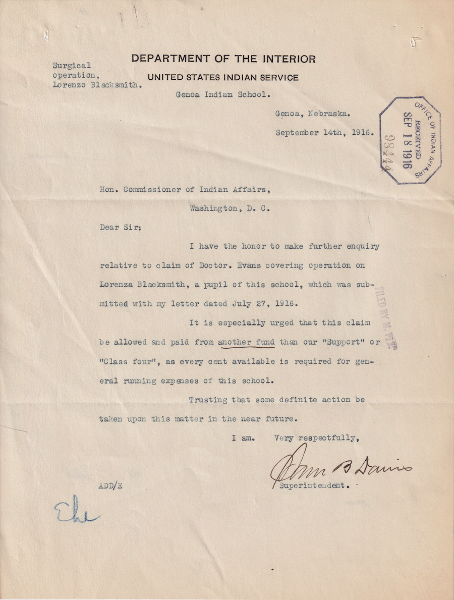 Letter from Sam B. Davis to the Commissioner of Indian Affairs, 14 Sept. 1916; Folder: 28797-1916-732, Box 19; Central Classified Files, 1907–1939 (NAID 300324); Office of Indian Affairs; Record Group 75; National Archives and Records Administration-Washington, DC.