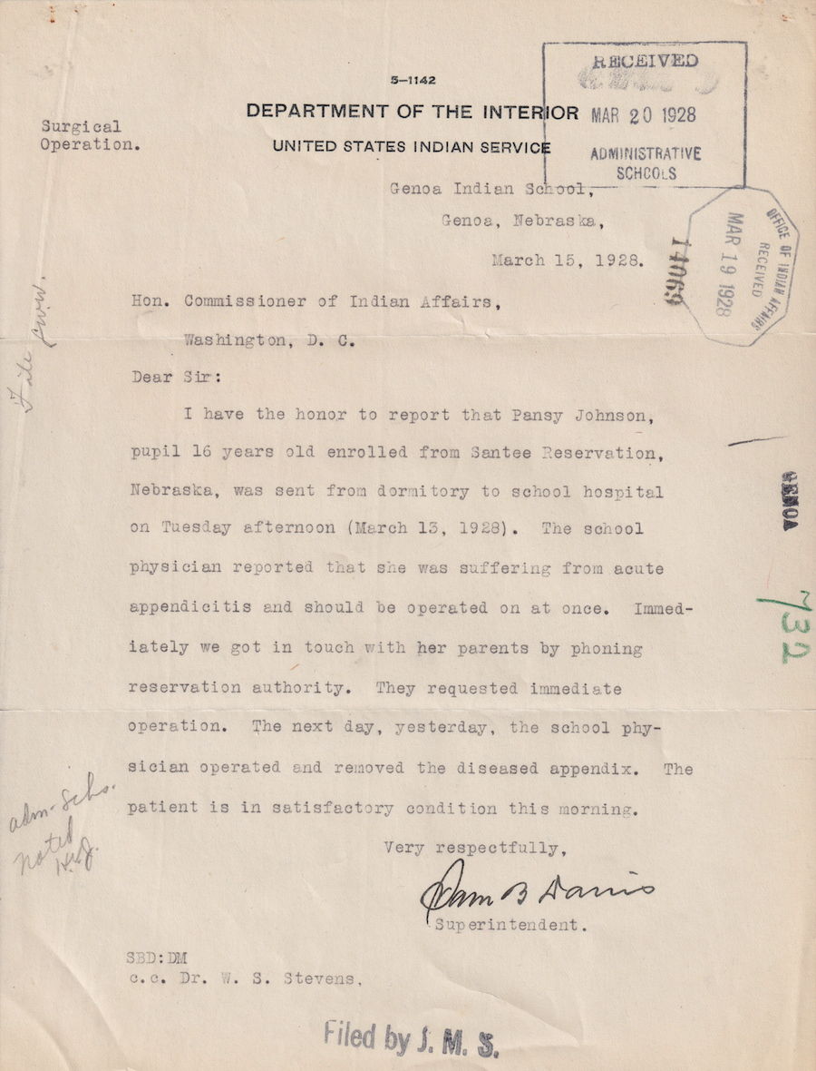 Letter from Sam B. Davis to the Commissioner of Indian Affairs, 15 Mar. 1928; Folder: 14069-1928-732, Box 19; Central Classified Files, 1907–1939 (NAID 300324); Office of Indian Affairs; Record Group 75; National Archives and Records Administration-Washington, DC.