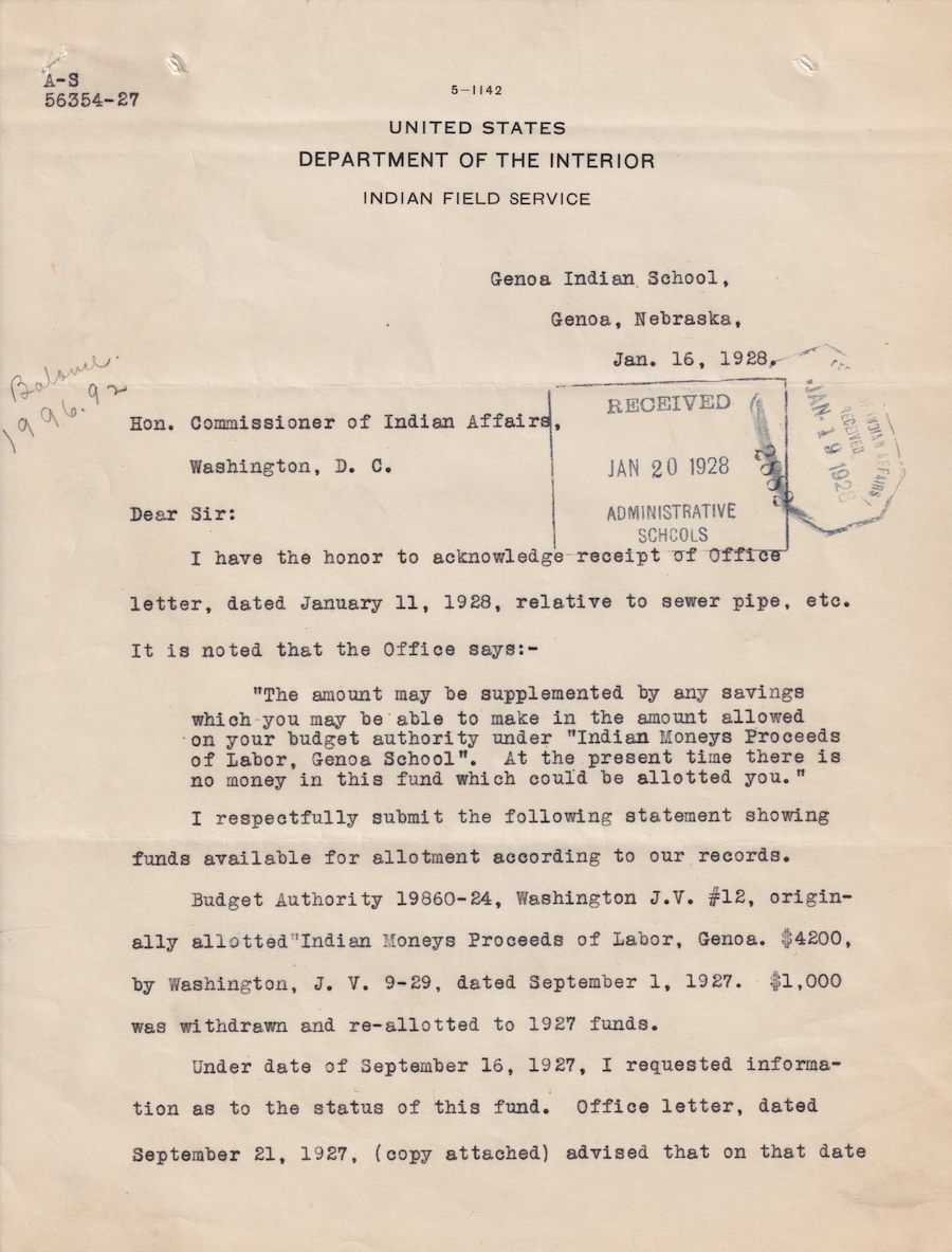 Letter from Sam B. Davis to the Commissioner of Indian Affairs, 16 Jan. 1928