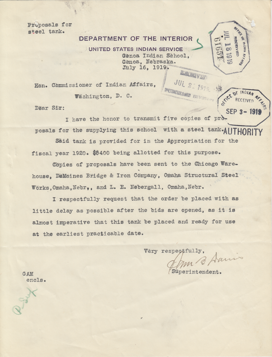 Letter from Sam B. Davis to the Commissioner of Indian Affairs, 16 July 1919; Folder: 83054-1917-424, Box 17; Central Classified Files, 1907–1939 (NAID 300324); Office of Indian Affairs; Record Group 75; National Archives and Records Administration-Washington, DC.