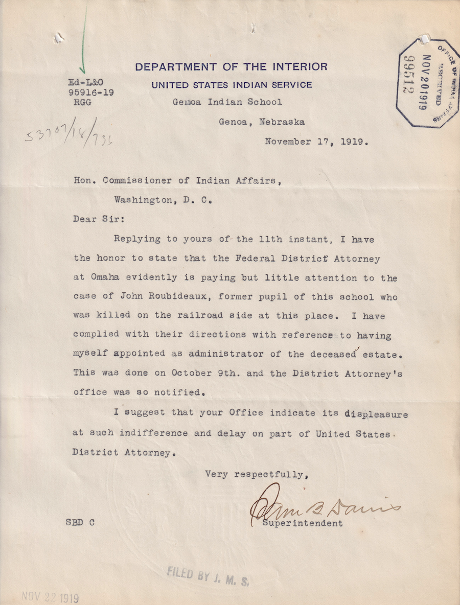 Letter from Sam B. Davis to Commissioner of Indian Affairs, 17 Nov. 1919; Folder: 53707-1918-736, Box 20; Central Classified Files, 1907–1939 (NAID 300324); Office of Indian Affairs; Record Group 75; National Archives and Records Administration-Washington, DC.