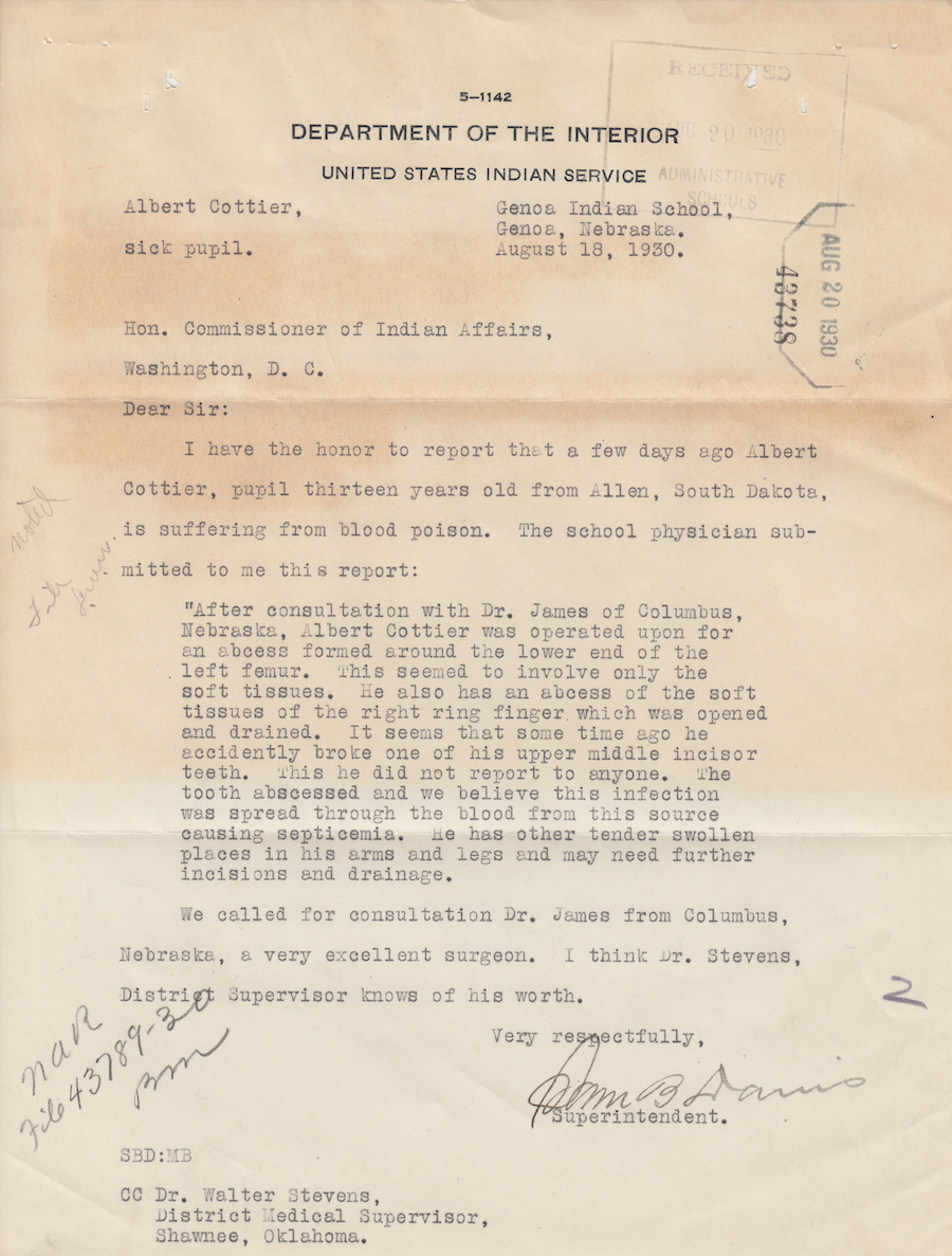Letter from Sam B. Davis to the Commissioner of Indian Affairs, 18 Aug. 1930; Folder: 43292-1930-730, Box 19; Central Classified Files, 1907–1939 (NAID 300324); Office of Indian Affairs; Record Group 75; National Archives and Records Administration-Washington, DC.