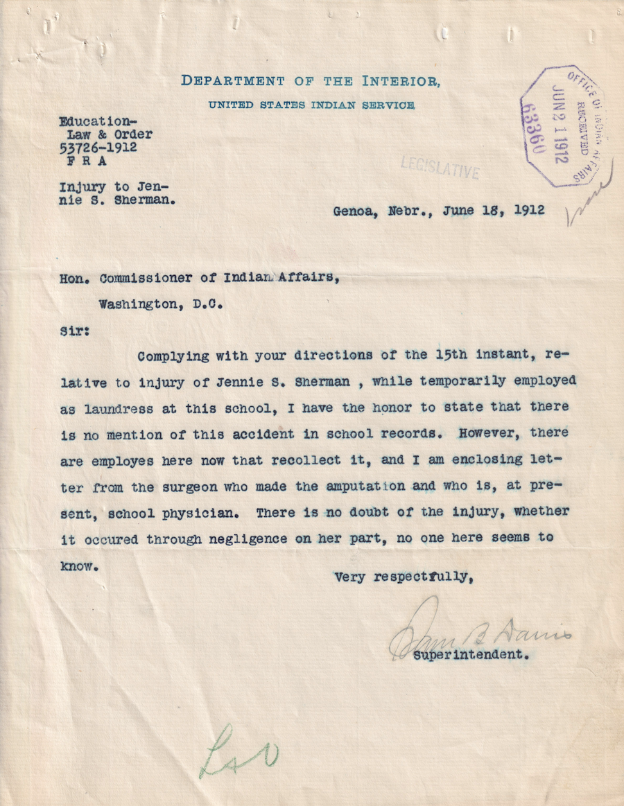 Letter from Sam B. Davis to the Commissioner of Indian Affairs, 18 June 1912; Folder: 53726-1912-732, Box 19; Central Classified Files, 1907–1939 (NAID 300324); Office of Indian Affairs; Record Group 75; National Archives and Records Administration-Washington, DC.