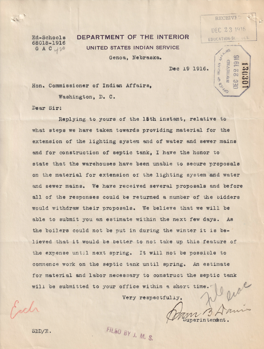 Letter from Sam B. Davis to the Commissioner of Indian Affairs, 19 Dec. 1916; Folder: 68018-1916-420, Box 17; Central Classified Files, 1907–1939 (NAID 300324); Office of Indian Affairs; Record Group 75; National Archives and Records Administration-Washington, DC.