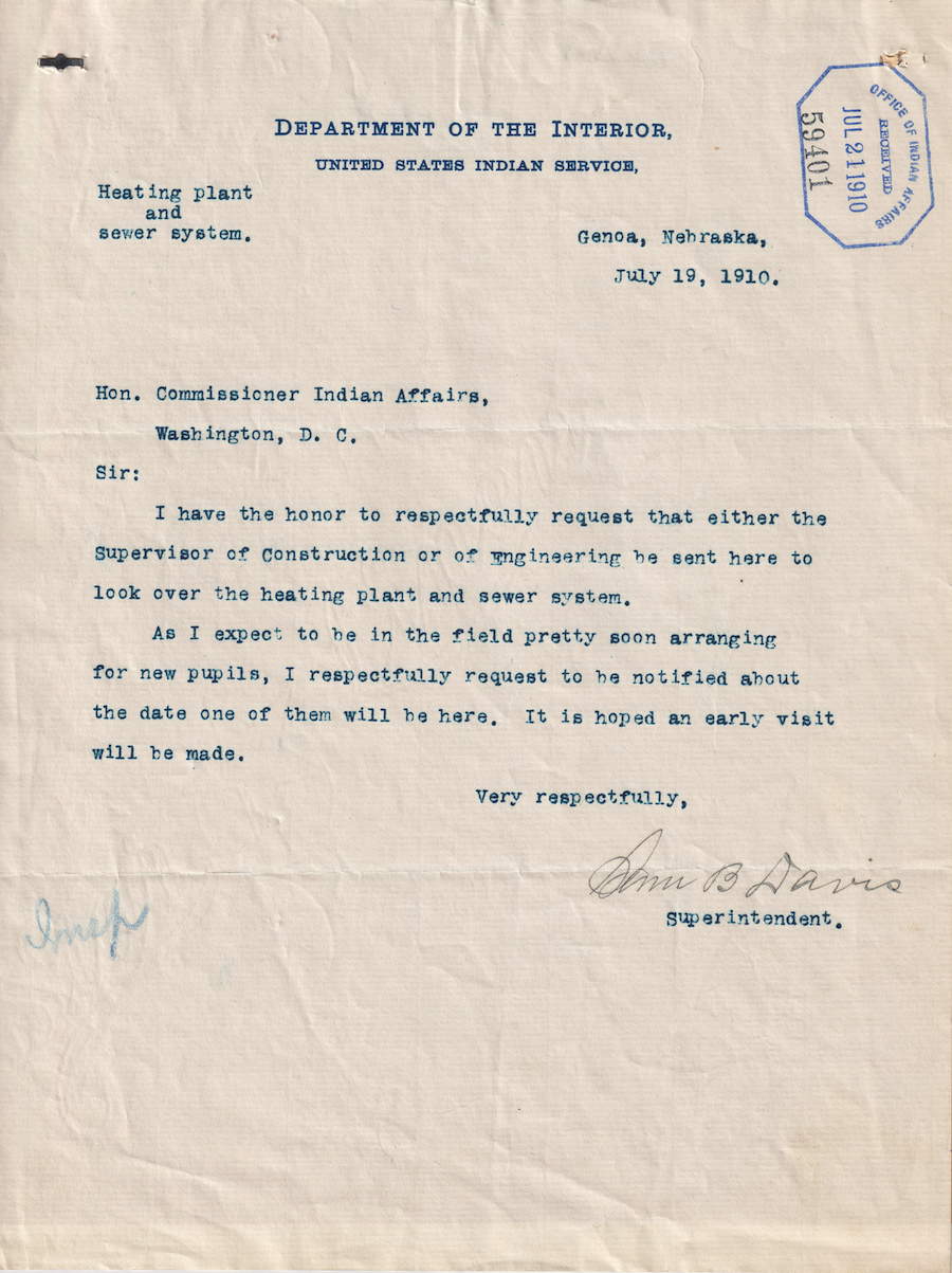 Letter from Sam B. Davis to the Commissioner of Indian Affairs, 19 July 1910; Folder: 59401-1910-420, Box 17; Central Classified Files, 1907–1939 (NAID 300324); Office of Indian Affairs; Record Group 75; National Archives and Records Administration-Washington, DC.