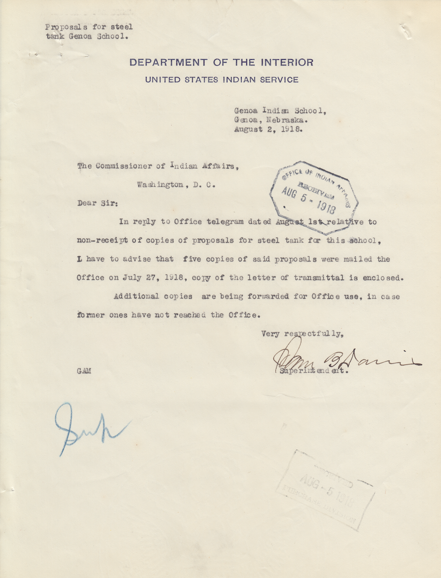 Letter from Sam B. Davis to the Commissioner of Indian Affairs, 2 Aug. 1918; Folder: 83054-1917-424, Box 17; Central Classified Files, 1907–1939 (NAID 300324); Office of Indian Affairs; Record Group 75; National Archives and Records Administration-Washington, DC.